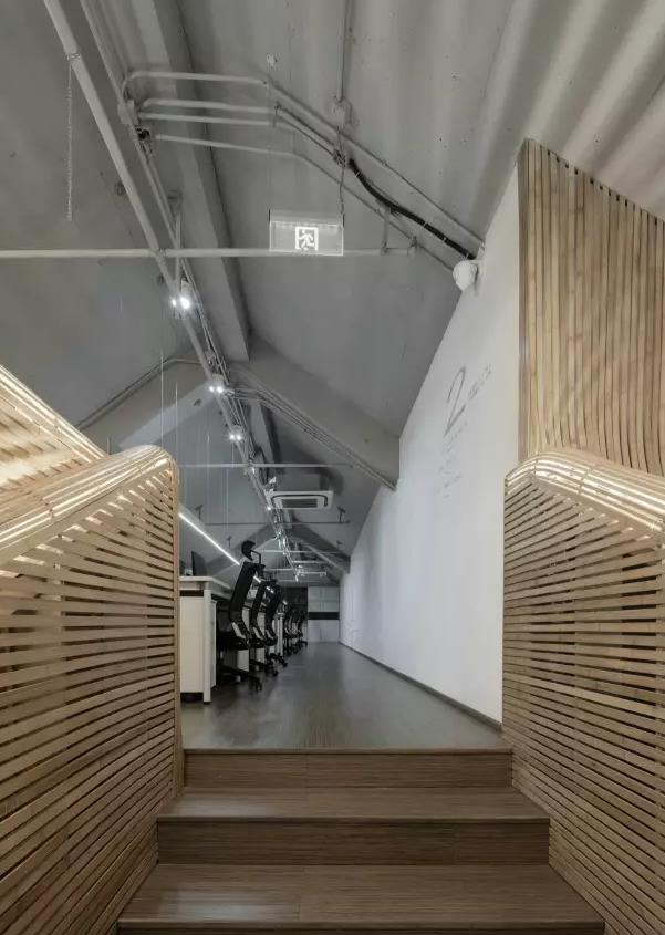 高端文化傳媒辦公室設(shè)計:將竹子的元素運用在這里,并還原其本身的色彩。藝術(shù)必須出自于大自然,因為大自然已為人們創(chuàng)造出較獨特美麗的造型。而竹子作為一種建筑材料代表了古代亞洲建筑體系的內(nèi)涵, 而中國它的產(chǎn)量是足夠支撐裝飾材料的消耗的,并且有著高韌性、可塑性強的特點。在連接頂層的樓梯部分,我們沒有再讓竹子繼續(xù)沿用直線語素。頂面部分做曲線拼接,延續(xù)而上。